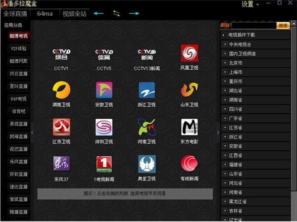 潘多拉魔盒是一款網(wǎng)絡(luò)電視播放器,支持電視直播和視頻點(diǎn)播功能,本軟件擁有全球近1000個(gè)電視頻道直播,包括國(guó)內(nèi)衛(wèi)視、中央頻道、數(shù)字付費(fèi)頻道、全國(guó)各地方臺(tái)、港澳臺(tái)電視頻道以及國(guó)外電視臺(tái)等。