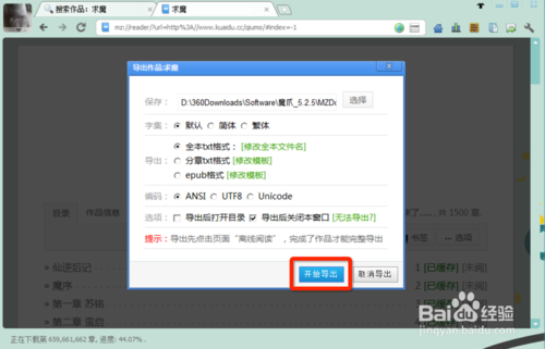當(dāng)所有章節(jié)都變成“已緩存”了以后,我們就可以點(diǎn)目錄上的“導(dǎo)出作品”按鈕了!點(diǎn)擊后,會(huì)出現(xiàn)導(dǎo)出作品的窗口。根據(jù)你的喜好進(jìn)行選擇,然后我們直接點(diǎn)擊“開(kāi)始導(dǎo)出”。