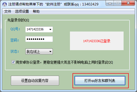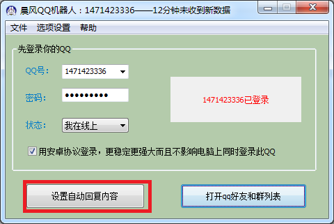 登陸QQ成功后,即可點(diǎn)擊“設(shè)置自動回復(fù)內(nèi)容”進(jìn)行設(shè)置。