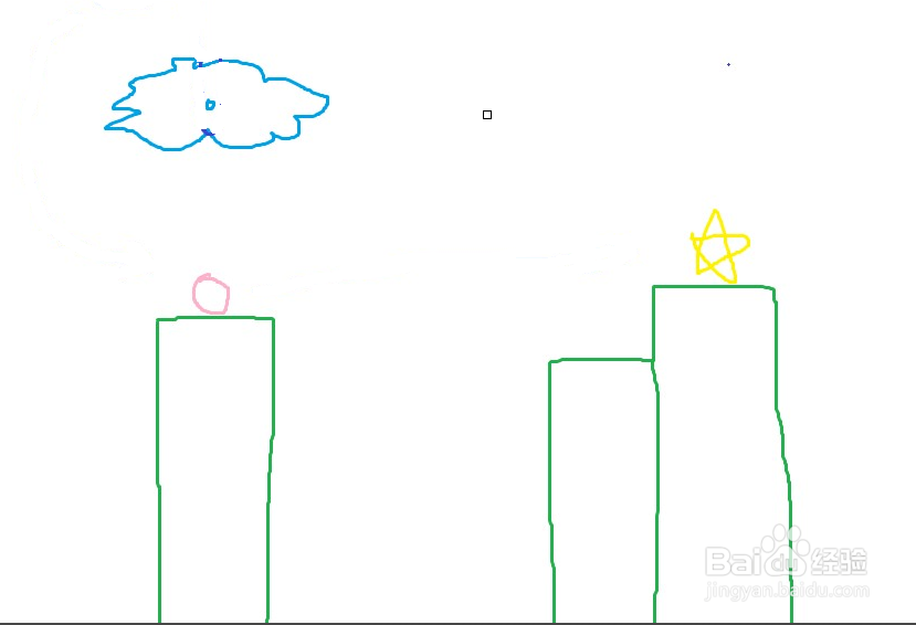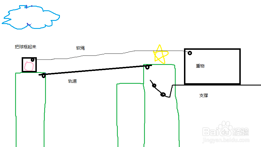 這一關(guān)那,比較簡(jiǎn)單,沒有之前那么難,可能也是這一大關(guān)都是類似的方法的緣故吧。首先,在上方搭建一個(gè)軌道,如下圖所示,畫曲線的時(shí)候盡量平滑,貼著云的邊畫。