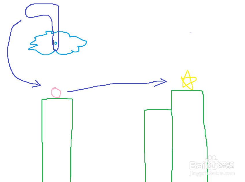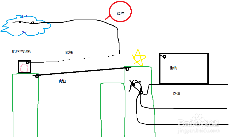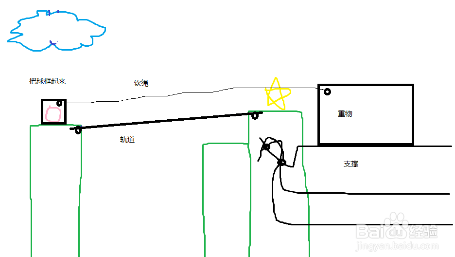 1, 畫一個(gè)小圓圈代表軸,軸可以畫在任何固定的位置。2,在軸上畫一個(gè)大圓可以變成滑輪。3,鏈接兩個(gè)軸的線會(huì)成為一條軟繩。4,如果軟繩兩段出頭,會(huì)成為一個(gè)穩(wěn)定的支撐。5,沒有支撐的物體都會(huì)往下掉。6,畫一個(gè)大框可以把小球包裹起來。7,右鍵是橡皮擦除。