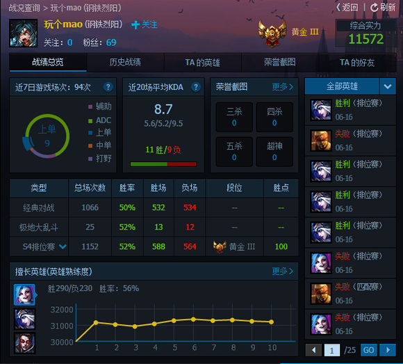2、點(diǎn)擊戰(zhàn)績(jī)總覽,可以看到自己近七日的位置使用情況;最近20場(chǎng)的平均表現(xiàn),KDA越高表示每次死亡所帶來(lái)的價(jià)值越高;右上角可以看到自己所處的段位。