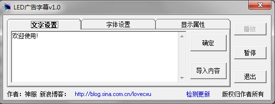 LED廣告滾動(dòng)字幕是一款簡(jiǎn)單的字幕滾動(dòng)工具,適合大多數(shù)商家、學(xué)校、公司,用于的共用電腦上循環(huán)播放店鋪優(yōu)惠、推廣信息、等內(nèi)容,目前為第一版本,功能不完善,希望大家支持。