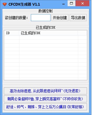 隨風(fēng)CFCDK生成器能夠通過(guò)隨機(jī)的算法,計(jì)算出騰訊的CDK值。創(chuàng)建出來(lái)的CDK并非百分之百能用,只是有幾率出現(xiàn)能正常使用。有可能創(chuàng)建的出來(lái)的,有百分之90是錯(cuò)誤的,百分之9是已被使用的,剩余百分之1是能正常抽獎(jiǎng)的。而這百分之一的幾率,便會(huì)出各式各樣的CF道具,如火麒麟等道具~當(dāng)然,前提是你有幾率獲取這百分之1的概率,若不想出錢購(gòu)買CFCDK,而你又有時(shí)間,那么每天有事沒(méi)事就提取幾次,估計(jì)有那么一天你就能抽中。