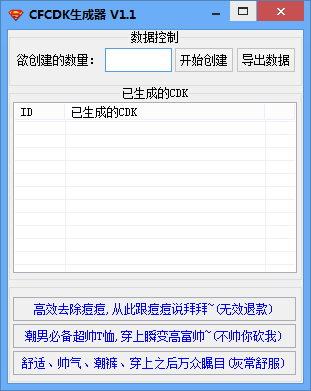 隨風(fēng)CFCDK生成器能夠通過隨機(jī)的算法,計(jì)算出騰訊的CDK值。創(chuàng)建出來的CDK并非百分之百能用,只是有幾率出現(xiàn)能正常使用。有可能創(chuàng)建的出來的,有百分之90是錯誤的,百分之9是已被使用的,剩余百分之1是能正常抽獎的。而這百分之一的幾率,便會出各式各樣的CF道具,如火麒麟等道具~當(dāng)然,前提是你有幾率獲取這百分之1的概率,若不想出錢購買CFCDK,而你又有時間,那么每天有事沒事就提取幾次,估計(jì)有那么一天你就能抽中。