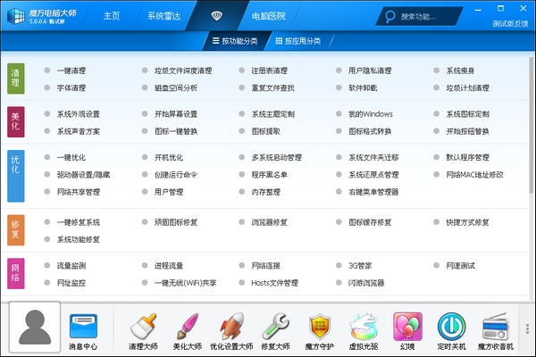 1、安裝好軟件之后,如下圖就是軟媒魔方6的主菜單界面啦。中間區(qū)域按照功能用途進行分類