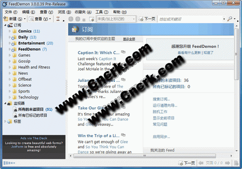 您可以完全自定義組織和顯示Feed 的方式,設(shè)置自定義的基于關(guān)鍵詞的新聞監(jiān)視器。預(yù)先配置的眾多Feed,讓您可以立即開始使用它。其內(nèi)建的Podcast接收程序可以下載音樂文件到您的 移動音頻設(shè)備。另外,FeedDemon可以與NewsGator Online自動同步,并與Bloglines等流行的RSS服務(wù)集成。