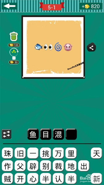 第七種純圖片的,有的是描繪一個(gè)故事,有的圖片就代表字,像圖中的圖片有魚、眼珠、一個(gè)攪拌的東西、豬,顯然成語(yǔ)是魚目混珠。