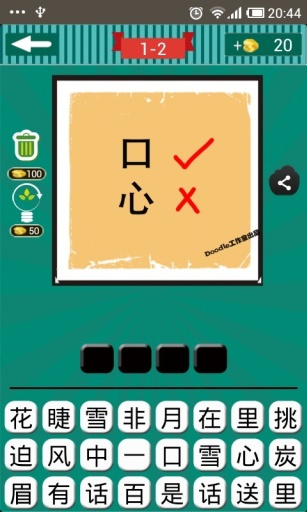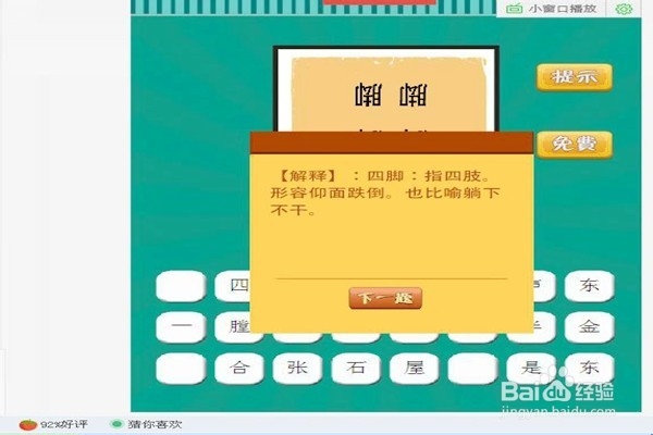 在打開(kāi)看圖猜成語(yǔ)游戲后,會(huì)出現(xiàn)一個(gè)方框。在方框中會(huì)給我們一些關(guān)于我們所要猜的成語(yǔ)的提示,在下面這個(gè)方框中,在口的后面打勾,而在心的后面打×,我們可以理解為口是心非。我們?cè)谙旅娴倪x項(xiàng)中分別找到口、是、心、非幾個(gè)字,在用鼠標(biāo)的左鍵點(diǎn)擊后,這些字上面的黑色的小方塊中會(huì)依次出現(xiàn)我們所點(diǎn)擊的字。如果我們的答案正確,就會(huì)彈出一個(gè)方框,顯示對(duì)這個(gè)成語(yǔ)的解釋,我們?cè)邳c(diǎn)擊下一題后,就會(huì)進(jìn)入下一題。