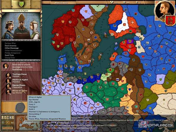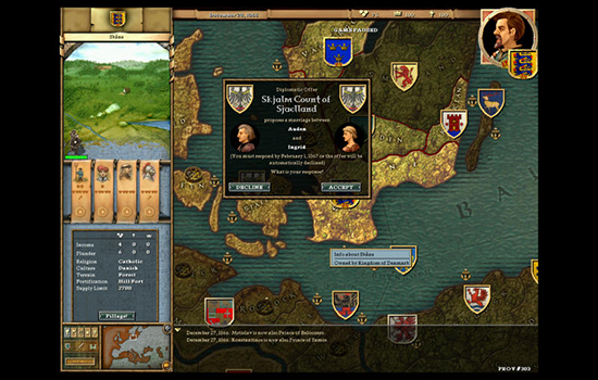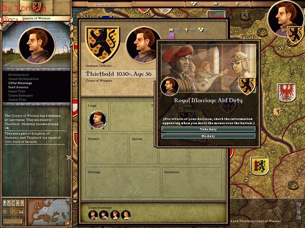 作為領(lǐng)主,他們也有義務(wù)為自己成年的后代保證前途,也就是王子們必須有土地,公主們必須及時(shí)出嫁,否則將每月自動(dòng)產(chǎn)生威望下降。國王第一個(gè)沒有土地的兒子將令其本人威望每月下降0.3,第二個(gè)-0.2,以后的幾個(gè)均-0.1。公爵和伯爵們沒有土地的兒子每一個(gè)都將減少本人威望0.1。不出嫁的公主也同理類似,效果完全相對(duì)應(yīng)。