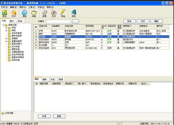 包括設(shè)備編號、設(shè)備名稱、型號規(guī)格、制造廠家、出廠日期、出廠編號、主機(jī)編號、購置日期、資金來源、啟用日期、安裝地點(diǎn)、操作人員、使用部門、設(shè)備狀況、設(shè)備原值、耐用年限、折舊年限、財(cái)務(wù)類別、設(shè)備分類、ABC分類、驗(yàn)收情況及設(shè)備標(biāo)識等項(xiàng)目,詳情功能請查看設(shè)備臺賬登記卡;