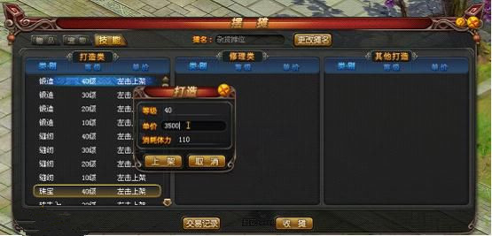 技能上架:擺攤界面切換至“技能”頁簽,左鍵選中技能輸入價(jià)格即可對該等級(jí)的技能標(biāo)價(jià),點(diǎn)擊“上架”即可。(技能不足無法打造該等級(jí)裝備的無法上架)。