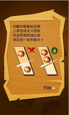 有100個關(guān)卡設(shè)置,每個關(guān)卡都有一個不規(guī)則形狀的木板,豎起你的食指輕輕一劃,木板就會脫落,把木板削到一定大小就可以過關(guān).是不是很簡單?不過要小心,每個木板里面都有幾個一直在移動的球球,一定不要切到哦!