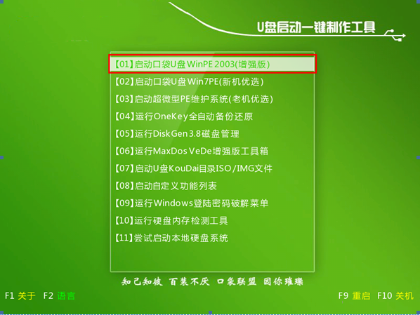 一、首先我們要把U盤制作成可啟動(dòng)U盤 ,具體步驟詳情請(qǐng)看《口袋U盤PE之啟動(dòng)U盤制作方法 》,制作好之后我們?cè)O(shè)置BIOS中為U盤第一啟動(dòng),具體的BIOS進(jìn)入方法請(qǐng)參考《不同品牌主板、筆記本、臺(tái)式電腦進(jìn)入BIOS的設(shè)置方法 》,設(shè)置好之后進(jìn)入口袋PE 菜單選項(xiàng)界面,我們選擇第一項(xiàng),等待進(jìn)入下一個(gè)界面。