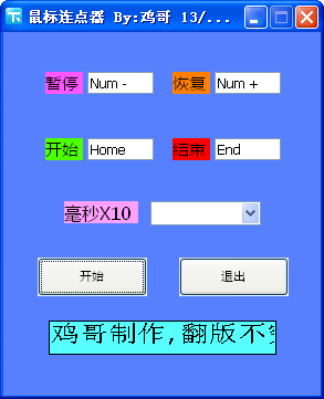 雞哥使用腳本制作的一款很簡單的鼠標連點器,具備開始、暫停、恢復(fù)、結(jié)束等基本操作,希望對你有幫助。