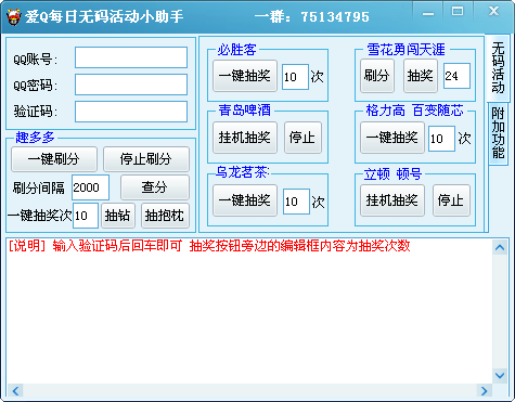 輸入驗(yàn)證碼后回車即可,抽獎(jiǎng)按鈕旁邊的編輯框內(nèi)容為抽獎(jiǎng)次數(shù)。