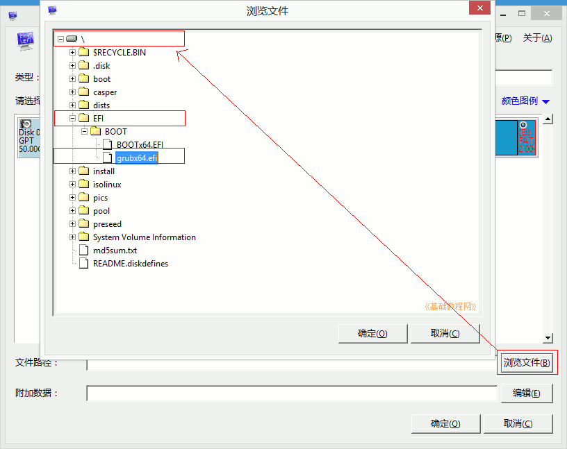 5)再點右下角的“瀏覽文件”按鈕,在面板中依次點開加號,找到“\EFI\BOOT\grubx64.efi”,點“確定”;