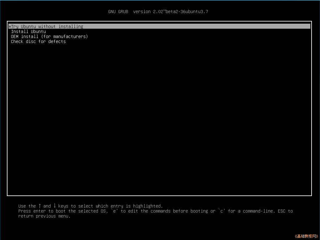 1)重新啟動后,出現(xiàn)Ubuntu安裝菜單,按回車鍵進入第一個試用Ubuntu(TryUbuntu);