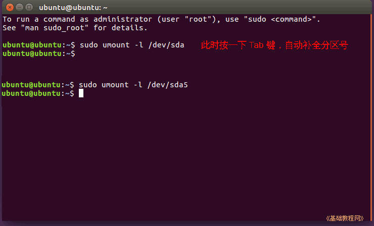 5)輸入命令sudoumount-l/dev/sda然后按一下Tab鍵,補上數(shù)字后,按回車鍵執(zhí)行,沒什么提示就是成功了,關閉終端;