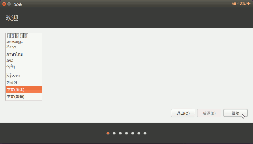 6)雙擊桌面上的“安裝Ubuntu16.04LTS”圖標,稍等出來一個“歡迎”面板,在左側欄選中“中文(簡體)”,點繼續(xù);