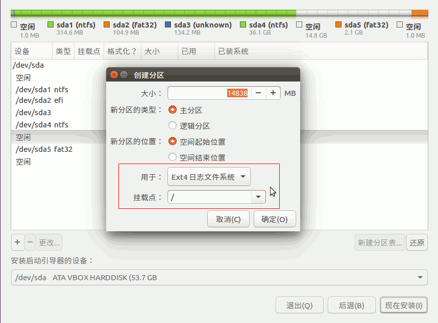 6)在出來的對話框中,設定用于分區(qū)的格式Ext4,在“掛載點”右邊點一下,選“/”,點“確定”