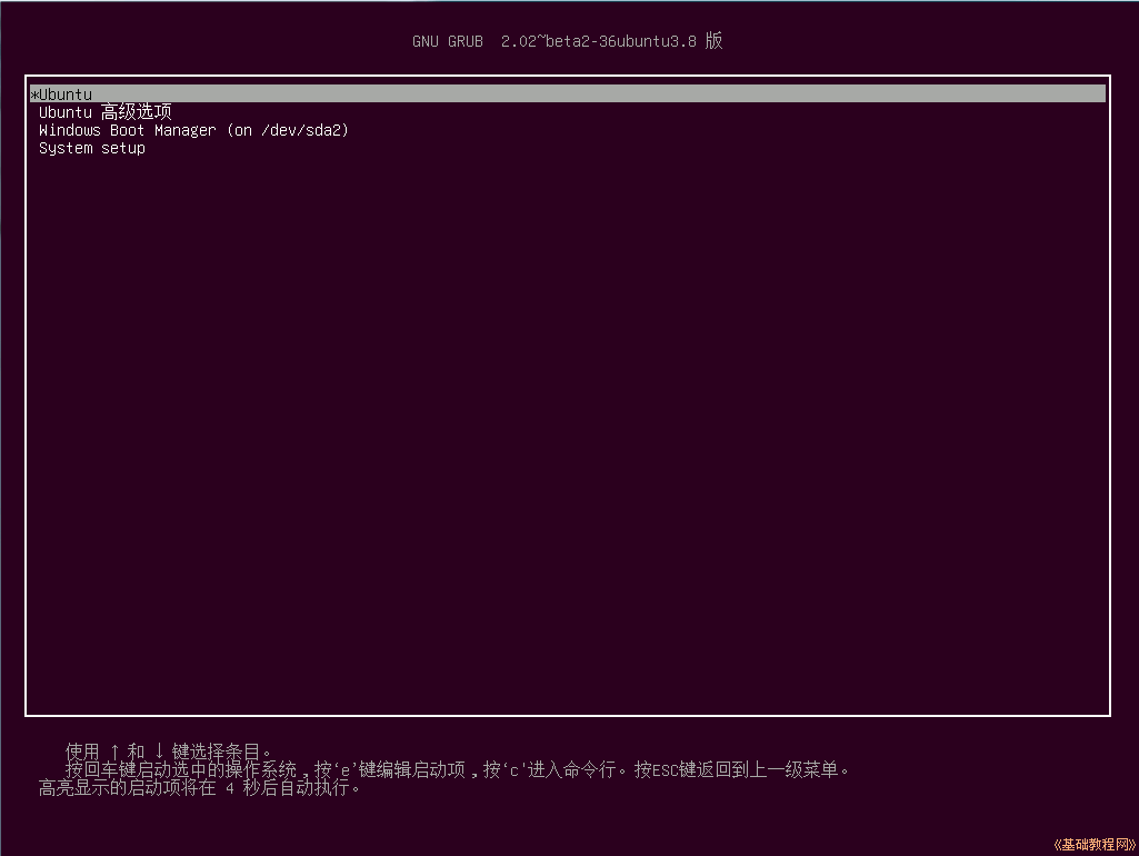 1)重啟后如果顯示Ubuntu啟動菜單,則表明安裝順利完成,可以按方向鍵選擇進入第一個Ubuntu或第三個Windows;
