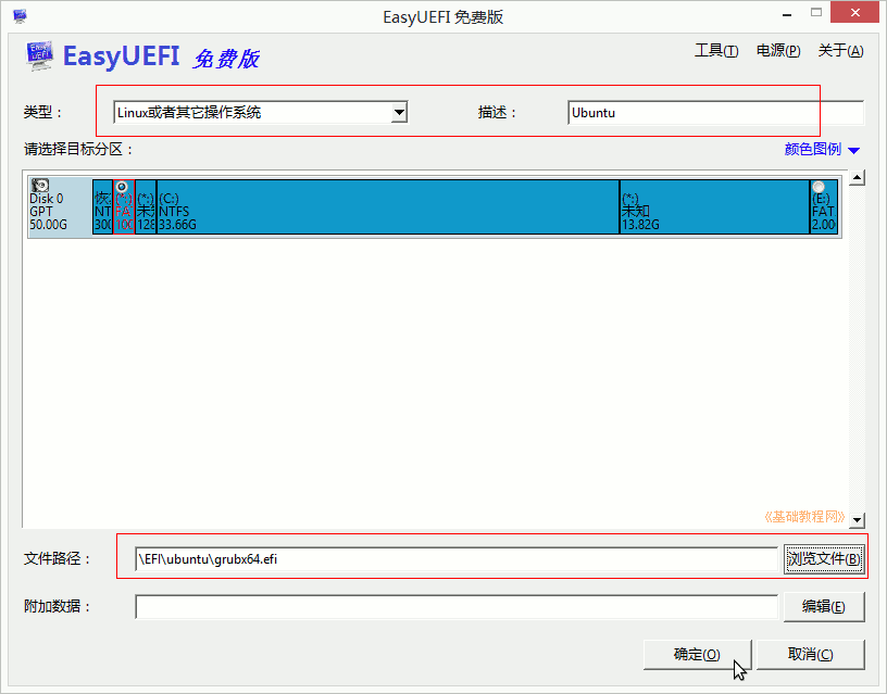 2)如果沒有顯示啟動菜單直接進入Windows,則運行EasyUEFI,點加號、選擇Linux、輸入名稱,選擇前面的100Mesp分區(qū),瀏覽文件找到\EFI\ubuntu\grubx64.efi;