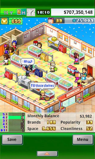 口袋服裝店是一款由Kairosoft開羅公司開發(fā)的服裝店經(jīng)營游戲,游戲中您將是一家服裝店的老板,通過自己的努力來經(jīng)營好服裝店??靵碓囋嚳纯茨隳苜嵍嗌馘X。