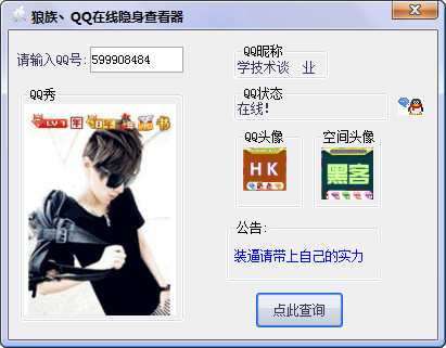 狼族QQ在線隱身查看器是一款主要用于查看好友是否在線和隱身的軟件,最新的2013QQ隱身查看器,不只是能查看好友,可以查看任意qq賬號(hào),還能看到頭像、昵稱等資料哦!