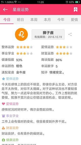 還在為沒有靠譜的運勢指導(dǎo)發(fā)愁嗎?最快,最專業(yè)的星座運勢是您最好的選擇!值得信賴!隨時隨地了解你的今日運勢,明日星座,本周運勢,本月運勢,今年運勢和愛情運勢!還在等什么呢?趕緊安裝吧!【軟件特色】