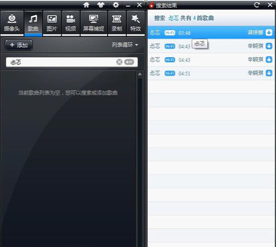 與常規(guī)的K歌軟件相似,基本的功能兼具包括切歌、原唱伴奏的切換、歌詞位置的變換等,在歌曲列表方面,目前沒有推薦曲目列表,只提供手動(dòng)搜索添加曲目。