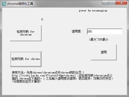 如何使用:點(diǎn)開chrome吧主頁,檢測(cè)句柄,輸入透明度即可!程序和微度新標(biāo)簽頁沖突,還有就是打開chrome吧主頁后檢測(cè)句柄之前要保持在這個(gè)頁面。