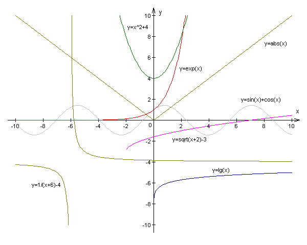zgrapher 支持的函數(shù)常用的都有,如:sin(x)、cos(x)、ln(x)、lg(x)、exp(x)、x^2、sqrt(x)……,還好看,可以看ZGrapher.chm的說明。