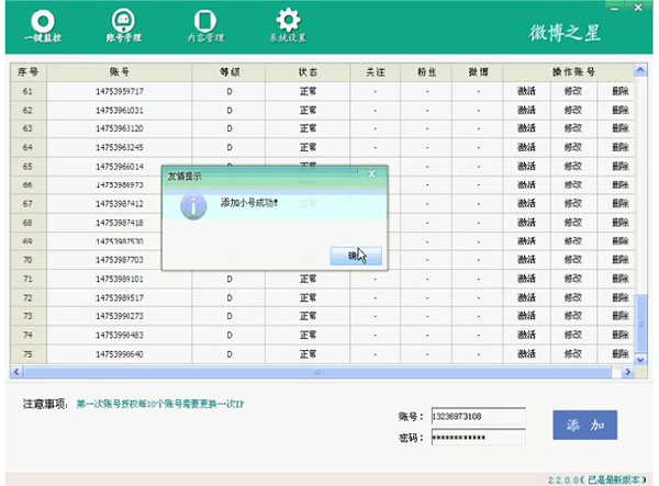 第1步:添加賬號:每IP授權10個賬號,避免封號。