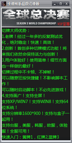 lol卡牌神手超級切牌器是專用于英雄聯(lián)盟游戲的卡牌大師切牌神器,lol卡牌切牌器的優(yōu)點(diǎn)是小巧綠色不含廣告并且無毒、切牌速度快,另外還可以像QQ一樣貼邊隱藏,乃是作弊利器,淘寶上同類產(chǎn)品要賣20元,現(xiàn)開發(fā)免費(fèi)版本供玩家使用,歡迎下載體驗(yàn)。