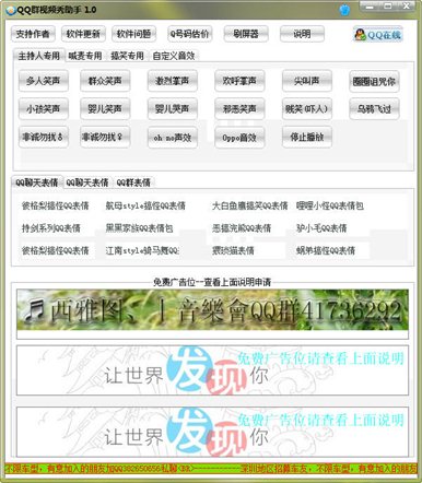 QQ群視頻秀助手是一款主要實(shí)現(xiàn)QQ視頻主持人或歌手的一些聲效,例如掌聲、歡呼聲、進(jìn)場聲效等等,還有更多QQ表情、QQ群表情提供下載,以及QQ號碼評估、刷屏器。