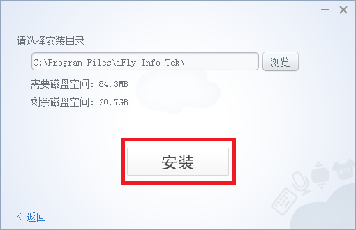 您可以點擊上圖中的【瀏覽】按鈕,選擇訊飛輸入法PC版安裝的路徑,選擇好路勁后,點擊此界面上的【安裝】按鈕即可自動安裝,如下圖所示: