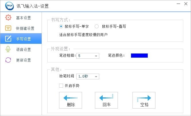 其他設(shè)置:可設(shè)置手寫抬筆時間,如果您手寫速度相對較慢,可將抬筆時間設(shè)置長一些。默認為1.0秒??稍O(shè)置是否開啟手勢,包括刪除、回車、空格,默認關(guān)閉。