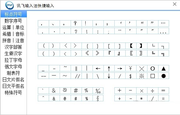 特殊符號輸入:點擊特殊符號輸入進入訊飛輸入法特殊符號面板,您可以隨心快捷輸入特殊符號,如下圖: