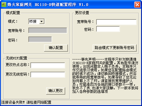 烽火家庭網(wǎng)關(guān)配置程序為了方便大家開啟家庭網(wǎng)關(guān)的路由模式,特別制作了烽火家庭網(wǎng)關(guān)HG110-B快速配置程序,只支持聯(lián)通寬帶,默認(rèn)應(yīng)該是橋接模式,使用本家庭網(wǎng)關(guān)配置程序,可以輕松開啟路由功能,有興趣的可以試一試。