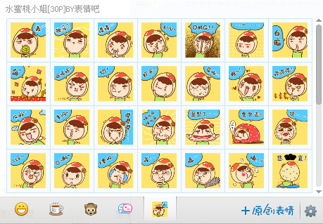 水蜜桃小姐表情包下載共30個(gè) 水蜜桃小姐是根據(jù)水蜜桃的形象制作的一個(gè)qq表情,共包括30個(gè)表情動(dòng)作,有灰啦、圖裂了、喵、白癡、8要啊、神馬、蝦米等,唯一不足的是,此套表情并不是動(dòng)態(tài)的,但依然無法掩蓋水蜜桃小姐的可愛,推薦MM們下載使用。