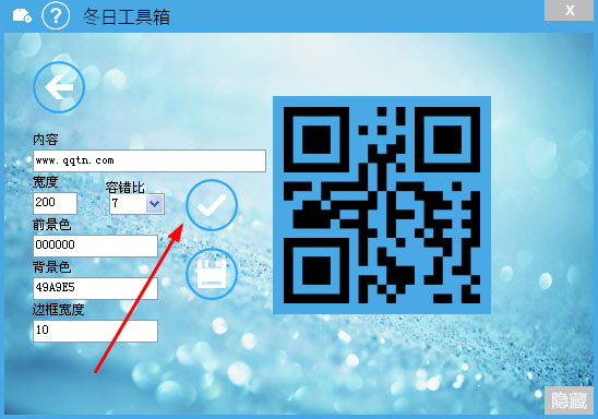 1、以下為二維碼工具界面,編輯好內(nèi)容參數(shù)后,點(diǎn)擊如下圖所示按鈕即可生成二維碼,下面的為保存按鈕。