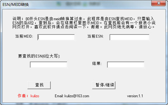 MEID/ESN轉(zhuǎn)換工具,80開頭ESN是同meid轉(zhuǎn)換算過來,此程序是同ESN查找MEID,只需輸入ESN的后6位,查到后,會(huì)在結(jié)果欄里顯示MEID。