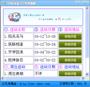 cf活動盒子是專用于穿越火線游戲的輔助工具,實時更新cf最新活動大全,讓玩家不錯過任何一個cf活動,本版cf活動盒子為免更新版,永久免費使用。