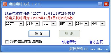 電腦定時關(guān)機 V1.39 簡體中文綠色特別版 簡單實用的電腦定時關(guān)機軟件??梢灶A(yù)先設(shè)定關(guān)機日期和時間,到達(dá)預(yù)定時間后電腦自動啟動關(guān)機模塊。關(guān)機模塊為倒計時方式,如果用戶想取消關(guān)機,可以在10秒鐘內(nèi)取消。