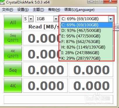 7.另外還可以單獨(dú)選擇某個(gè)盤符進(jìn)行讀寫速度的測(cè)試。