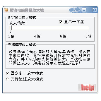 考慮到視力障礙人士的個(gè)性化需求,本電腦屏幕放大鏡軟件提供如下兩種放大模式供選擇:一,固定窗口放大模式:本模式下,光標(biāo)附近的內(nèi)容實(shí)時(shí)放大顯示在本軟件窗口內(nèi),可以提供2倍-8倍的放大效果,足以滿足您的需求,同時(shí)提供了十字準(zhǔn)星選項(xiàng)供選擇,方便瞄準(zhǔn)校對(duì)特殊內(nèi)容!