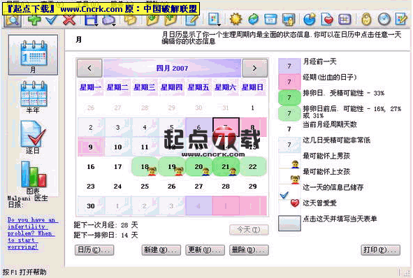 為女性設(shè)計(jì)的日歷軟件,能提醒要到來的經(jīng)期和排卵期,預(yù)測胎兒的性別和生日。能夠保存幾個日歷,密碼保護(hù),統(tǒng)計(jì),打印和輸出。多語言版本。