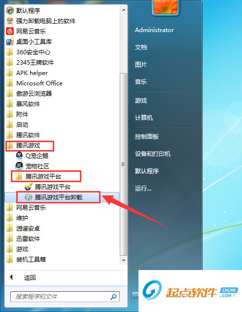 2、接著在“所有程序”中依次打開“騰訊游戲”→“騰訊游戲平臺”,之后在“騰訊游戲平臺”中點(diǎn)擊“卸載騰訊游戲平臺”,并根據(jù)提示點(diǎn)擊下一步就可以將其卸載了。