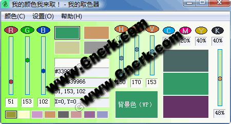 <我的取色器>軟件是一個(gè)專(zhuān)門(mén)用于從屏幕任意處取色的多功能綠色軟件,軟件本身同時(shí)還具備調(diào)色功能,并且分別用網(wǎng)頁(yè)顏色格式、RGB格式及十六進(jìn)制等多種形式表示,支持顏色的獲取、收藏、恢復(fù)、效果預(yù)覽、顏色疊加等功能,支持多種顏色模式(如RGB、HSV、CMYK等)以及多種顏色模式相互之間的轉(zhuǎn)換,是顏色的完全“加工廠”,非常適合廣大顏色愛(ài)好者、網(wǎng)頁(yè)制作者、程序員等等需要對(duì)顏色進(jìn)行調(diào)配的用戶(hù)使用。